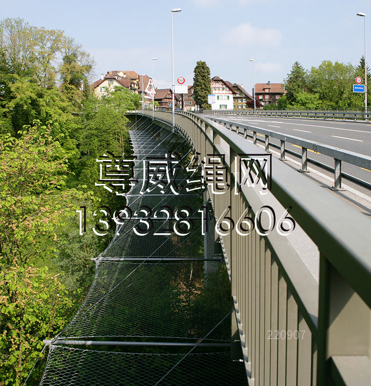 不銹鋼繩網做為高架橋兩側防護網是為高速公路專門設計的一種隔離網,橋梁防護不銹鋼繩網,由于不銹鋼繩網是由不銹鋼制作而成的,所以其具有非常強的抗腐蝕作用,能經的起風吹日曬,使用壽命長久,能有效的阻攔高速公路兩旁的動物的侵入的同時,也保護防止行駛在高速路上的車輛與不銹鋼繩網發生碰撞,由于不銹鋼繩網帶有很好的柔性,可以有效減小事故的傷亡及損失。不銹鋼繩網掛在吊橋或者是高架橋兩側,本身也可形成一種靚麗的風景線,可使行駛在路上的人們心情愉悅。